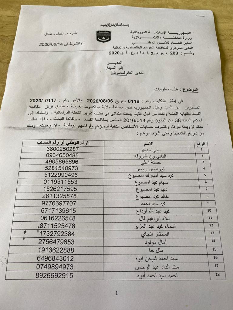 وذلك في رسالة وجهها قطب مكافحة الحرائم الإقتصادية إلى البنوك الموريتانية يوم الجمعة الماضي 14 أغسطس 2020، موضحا أن الأمر يأتي في إطار «التكليف رقم 0116 بتار6أغسطس 2020 موضحا أن الحصول على هذه المعلومات المتعلقة بحسابات بنكية للمشمولين في التحقيق اغلبهم من المحيط العائلي للرئيس السابق وبعض وزرائه وكبار المسؤولين في إدارته يدخل ضمن «البحث الابتدائي في قضية تقرير اللجنة البرلمانية، واستناداً إلى أحكام المادة 38 من القانون 014/2016 الخاص بمكافحة الفساد».